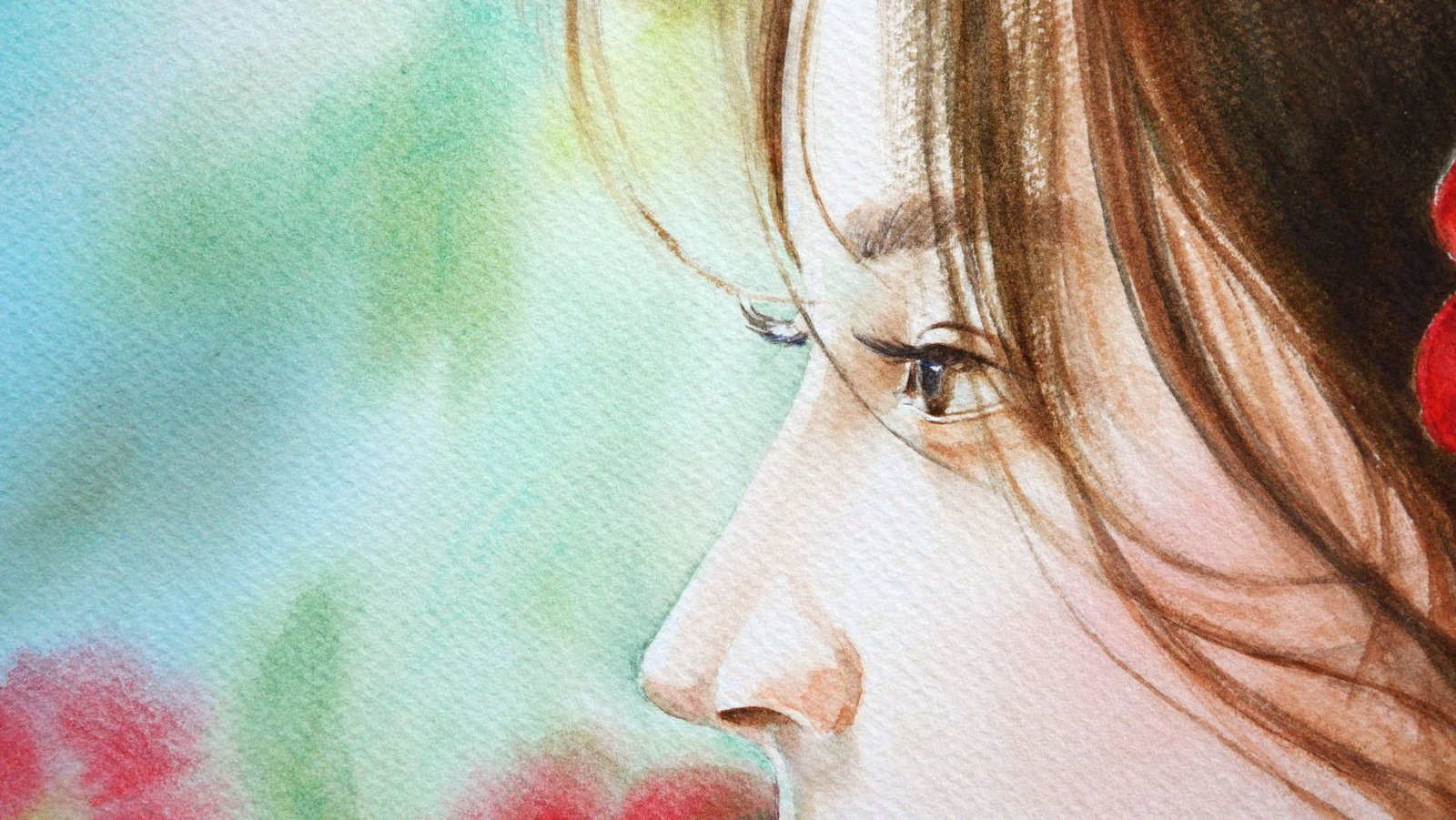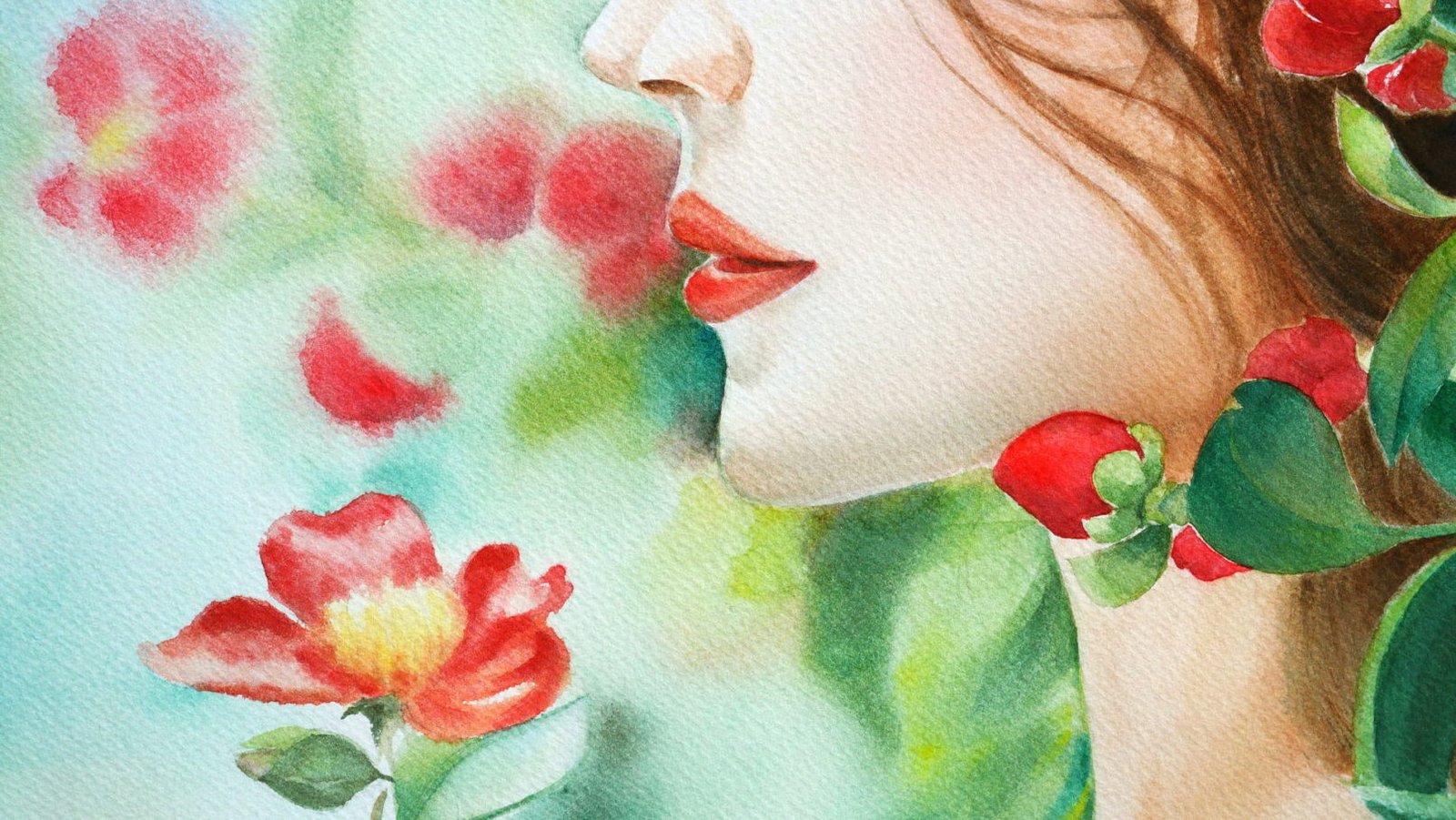 This is an original watercolour painting of a beautiful young bride in a poetic garden of blooming camellias where she herself is the most gorgeous flower.